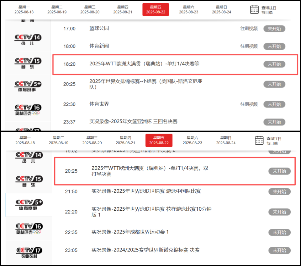 为了方便国内球迷观看比赛,央视体育频道将全程直播国乒的关键赛事,CCTV5频道从18:20开始,直播孙颖莎VS伊藤美诚、陈熠VS莎宾·温特以及林诗栋/黄友政VS郭勇/冯耀恩的比赛,CCTV5+频道则将从20:25开始直播两场重点赛事:孙颖莎/王曼昱VS金娜英/柳汉娜的女双半决赛